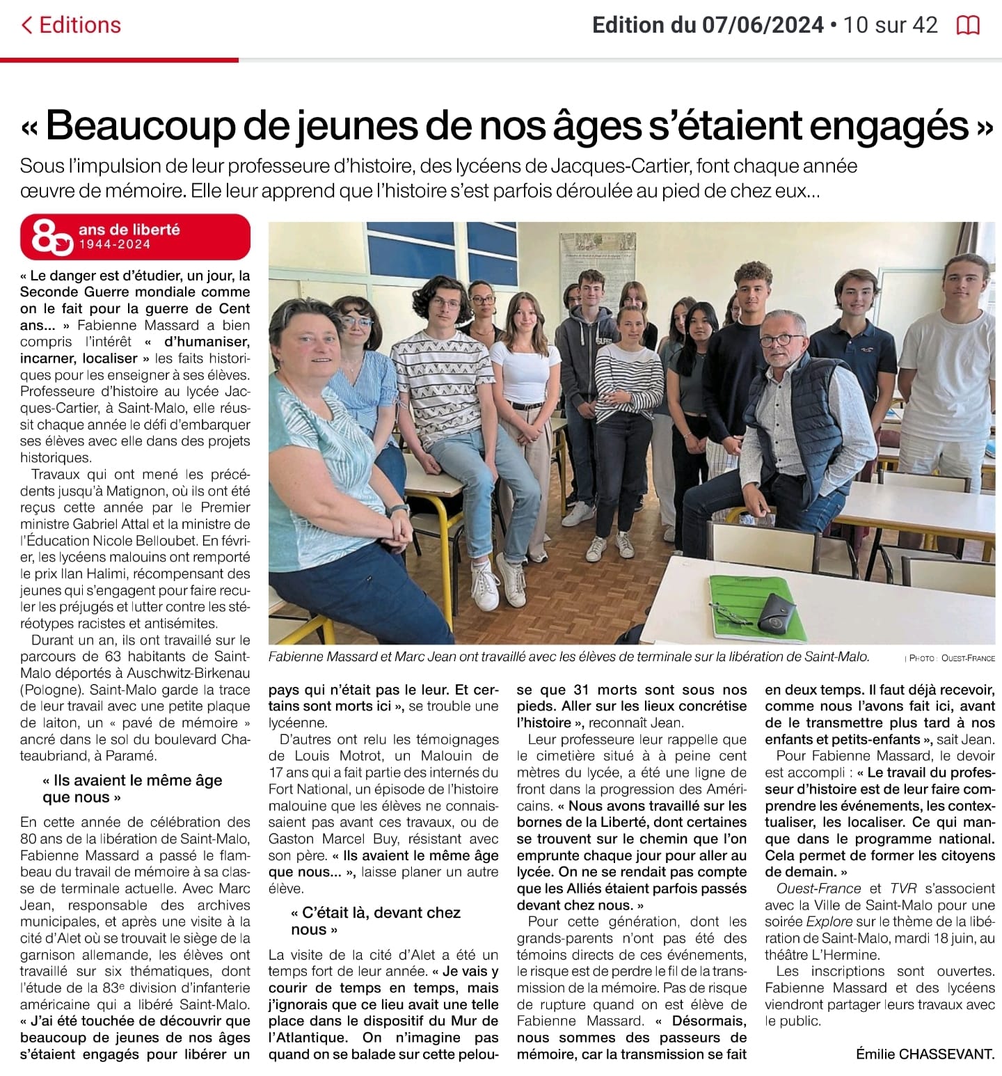 En 2024, une autre classe de terminale a travaillé sur la Libération de Saint-Malo dans le cadre du 80ième anniversaire des débarquements et de la Libération de la France.