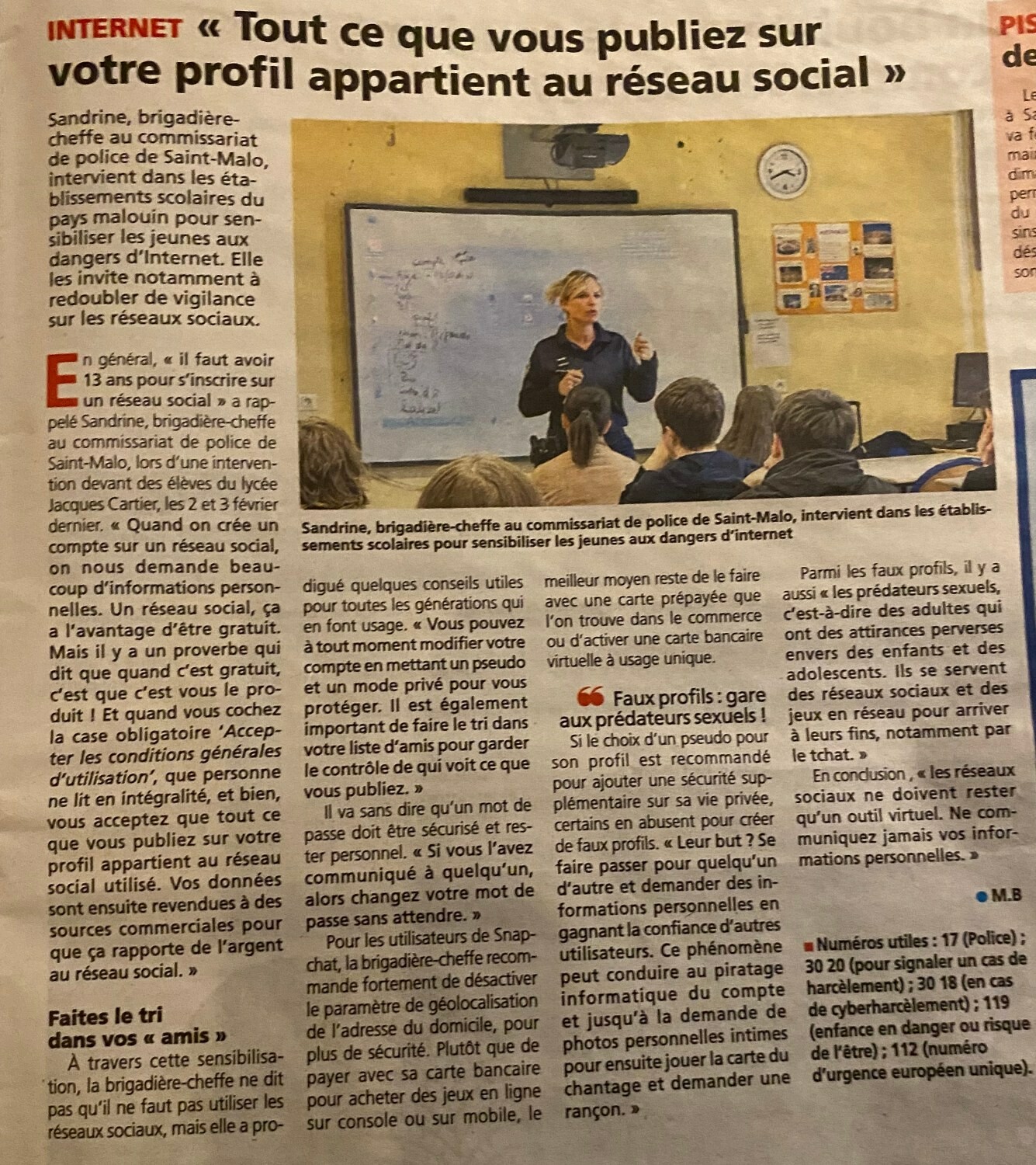 Visite d'une brigadière-cheffe du commissariat de St Malo pour sensibiliser les jeunes aux dangers d'Internet.